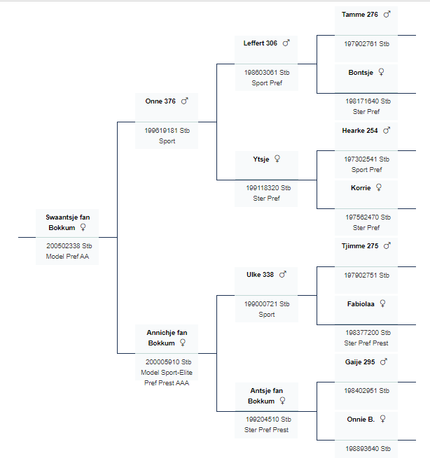 Swaantsje fan Bokkum Onne 376 x Ulke 338 geboortejaar: 2005 stokmaat: 1.64 Model Pref AA